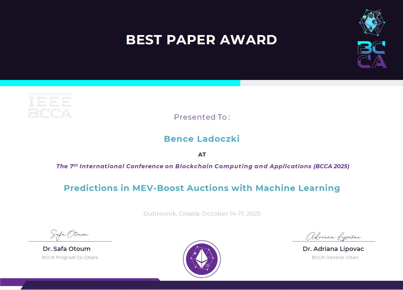 Tanszékünk munkatársa, Ladóczki Bence kapta a legjobb publikációnak kijáró díjat (Best Paper Award) a 2025 októberében Dubrovnikban megrendezett 7. International Conference on Blockchain Computing and Applications konferencián. Bence a gépi tanulás (mesterséges intelligencia), blokklánc témában adott elő. Cikkének címe: Predictions in MEV-Boost Auctions with Machine Learning.